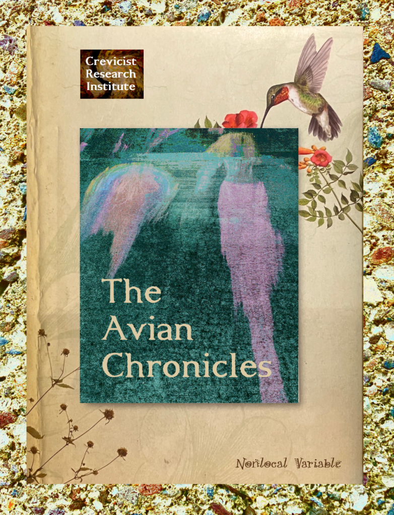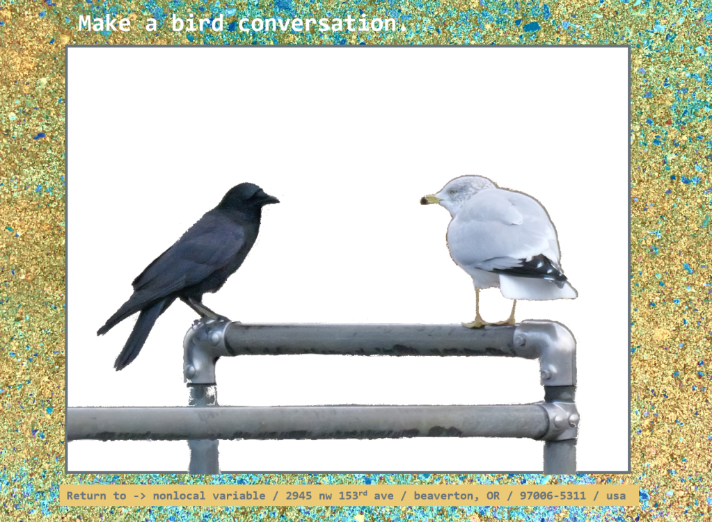 2025’s first Nonlocal Mail Art Call was about birds. What do these creatures think about what humans are doing to their habitat? We asked people to send in their bird conversation captions; 61 people responded, 87 pieces all told. Participants received a handmade 20-page booklet. A running dada narrative is embedded across all the pages.